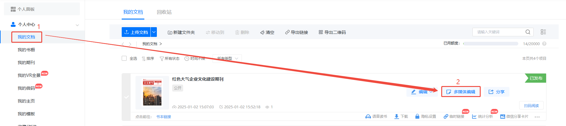 點進(jìn)【我的文檔】/【文檔】,選擇對應(yīng)電子書,點擊【多媒體編輯】/【內(nèi)容編輯】。