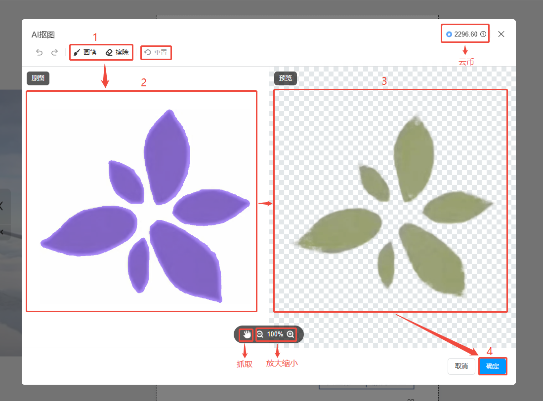在左側原圖區域,紫色部分為摳出來的部分,可以用畫筆涂畫出想要摳出來的部分或者擦除不想摳出來的部分,右側預覽區域查看最終效果,點擊右下角確定。