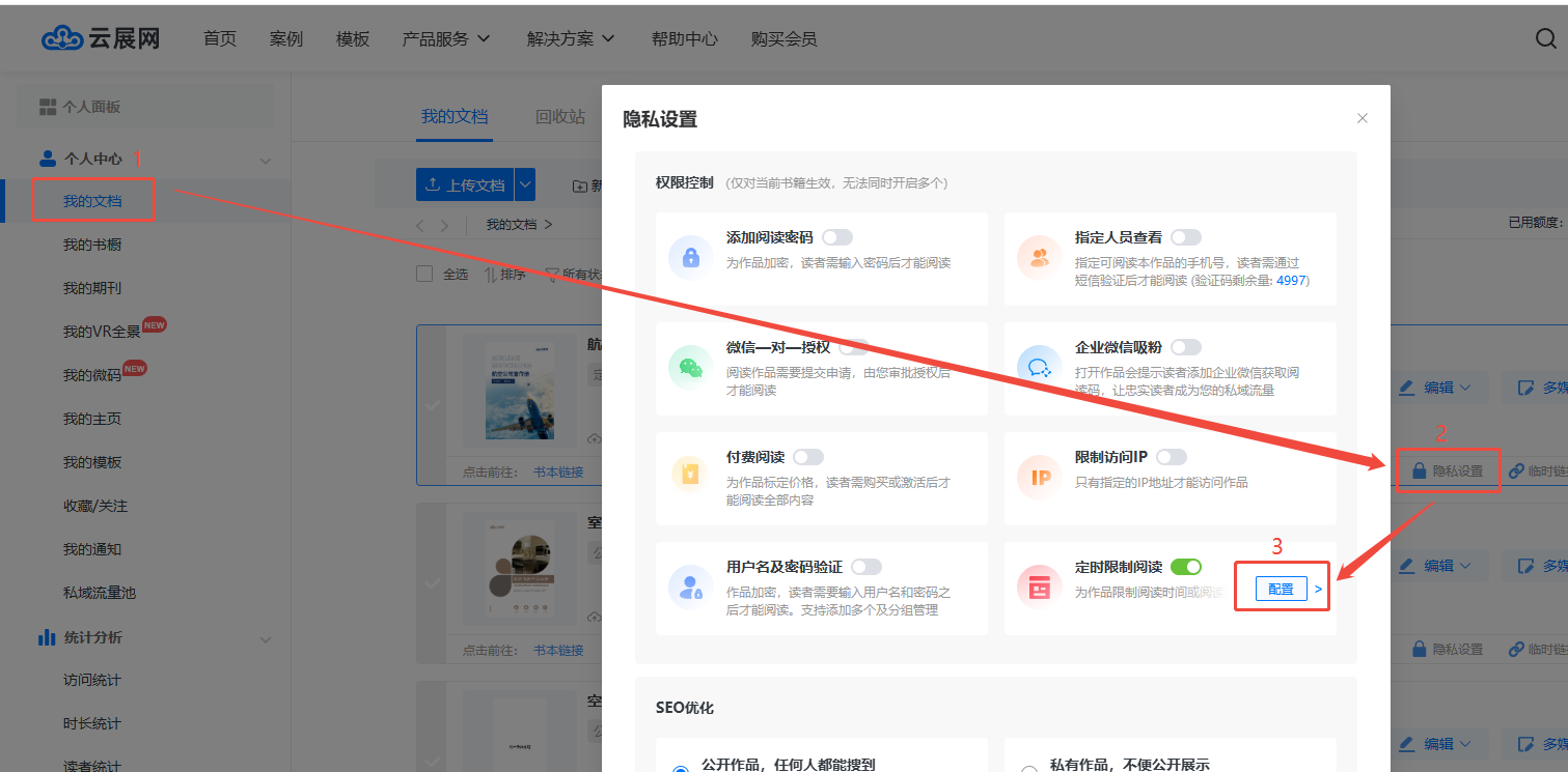 點擊【我的文檔】,再點擊【隱私設(shè)置】,開啟【定時限制閱讀】后,點擊【配置】。
