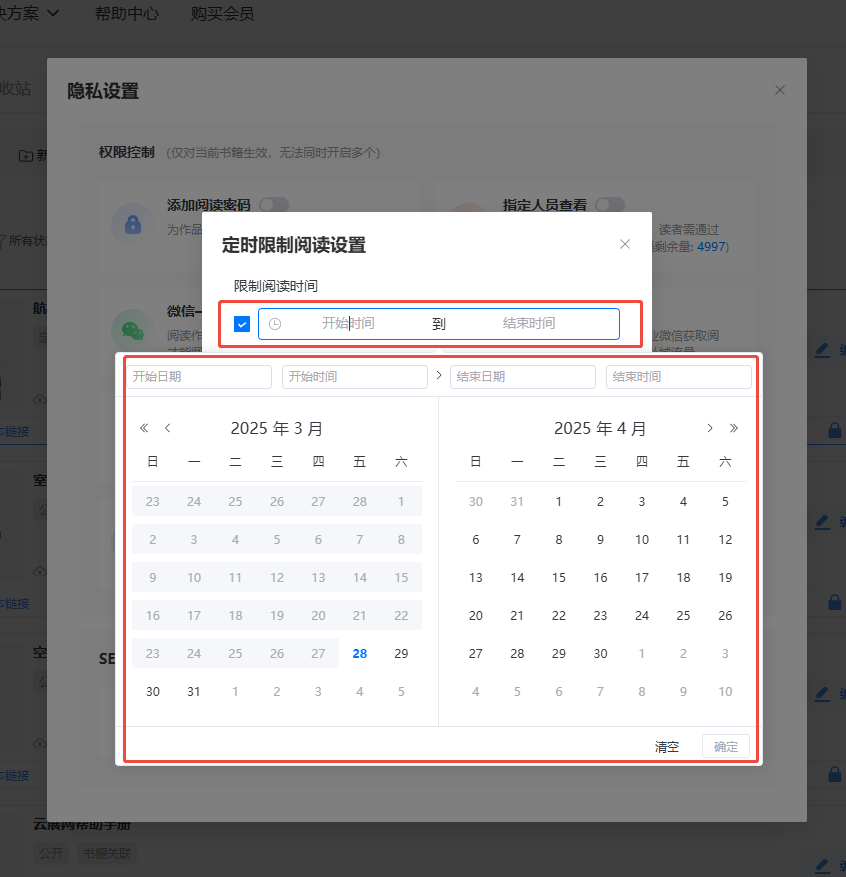 設(shè)置開啟日期時間和結(jié)束日期時間,在設(shè)置的這段時間內(nèi),書本可以正常閱讀。