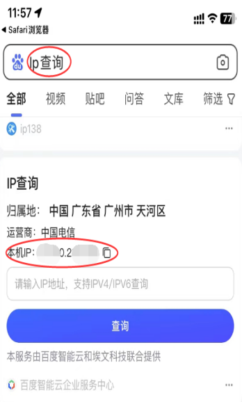 在電腦或者手機的瀏覽器上搜索【IP查詢】就可以獲取當前的網絡IP地址。