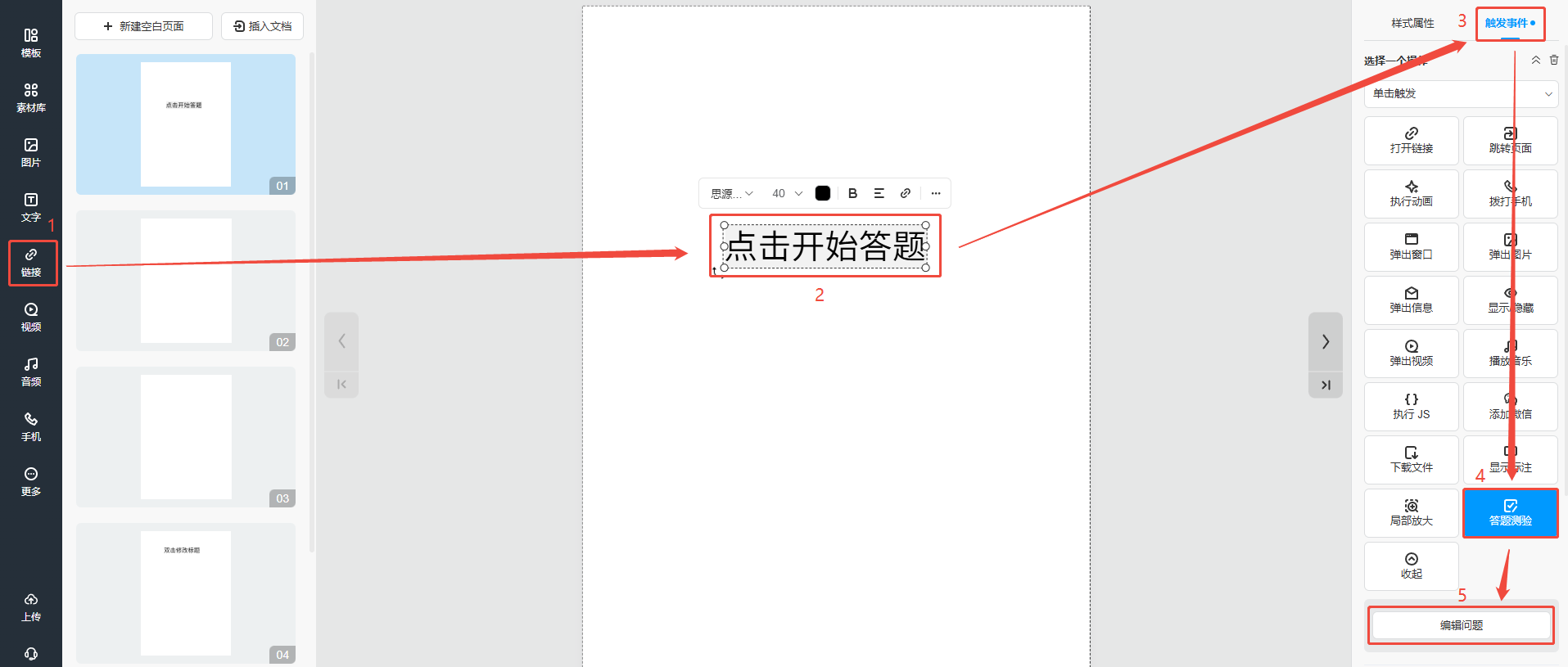 點擊【鏈接】,將出現在頁面上超鏈接放置到文字或者圖片上,點擊右上角【觸發事件】,選擇【答題測驗】,點擊【編輯問題】。