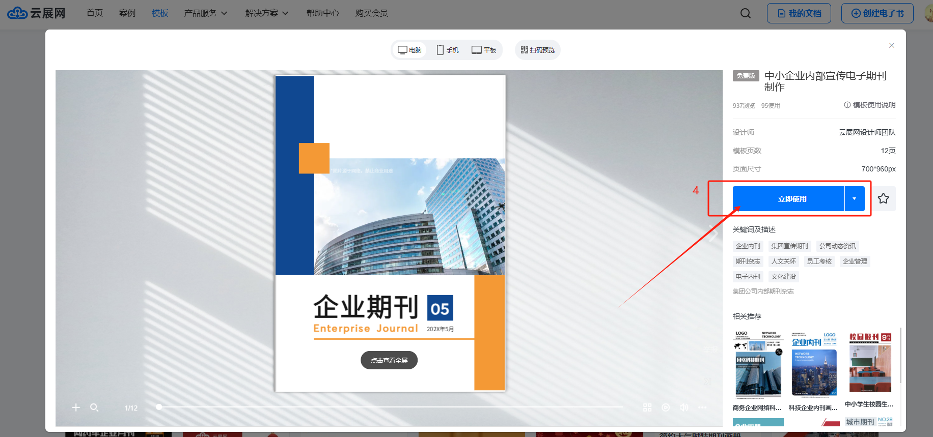 (1)在【模板】頁面,檢索關鍵詞選擇一款心儀的模板,點擊【立即使用】