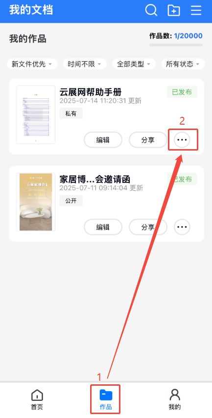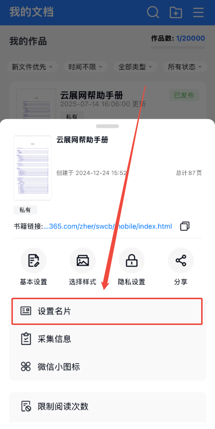 點(diǎn)擊【作品】,點(diǎn)擊對(duì)應(yīng)電子書(shū)右邊三個(gè)點(diǎn),然后點(diǎn)擊【設(shè)置名片】打開(kāi)名片設(shè)置界面。