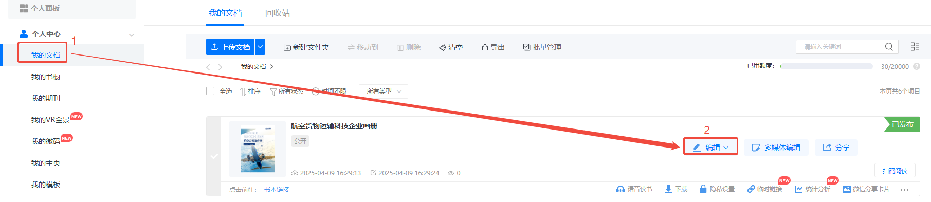 如何實現手機端豎屏雙頁顯示? 一、功能介紹 此功能可以讓電子畫冊在手機端上豎屏雙頁顯示。 二、操作步驟 1、打開編輯界面 點擊【我的文檔】,選擇需要設置的電子畫冊,點擊【編輯】。 2、設置雙頁顯示 點擊【設計】,然后點擊【設置】,把【單雙頁顯示】改為雙頁即可。 3、保存 點擊【保存/預覽】即可保存。
