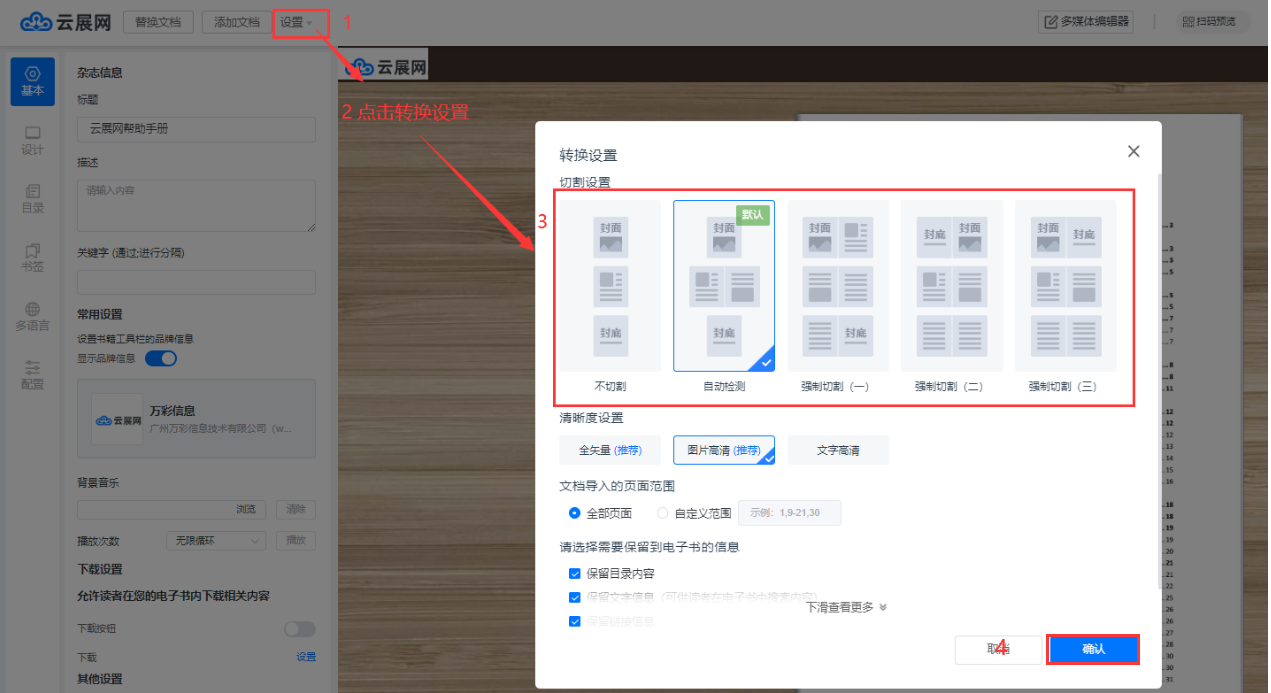 在【我的文檔】頁面,點擊【上傳文檔】打開上傳頁面,點擊【轉換設置】,選擇切割方式