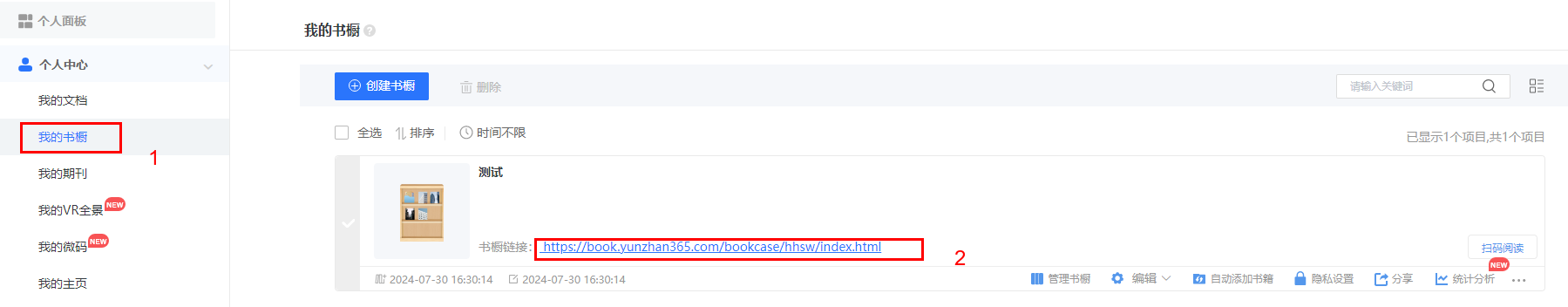 點擊【我的書櫥】,復制書櫥鏈接。如這個書櫥鏈接為:https://baijingtest.sharedbook.cn/bookcase/qbba/index.html
