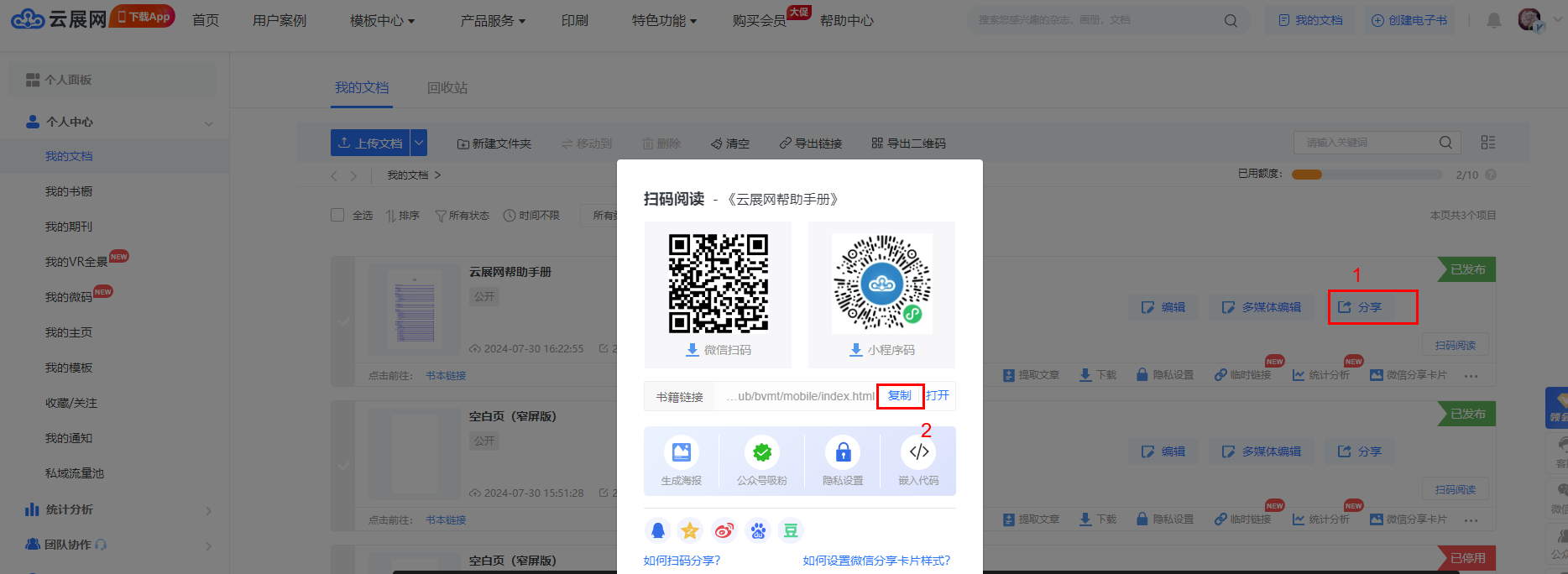 點擊【我的文檔】,【分享】復制書本鏈接,如這本書的鏈接為https://book.yunzhan365.com/kykh/tppo/mobile/index.html