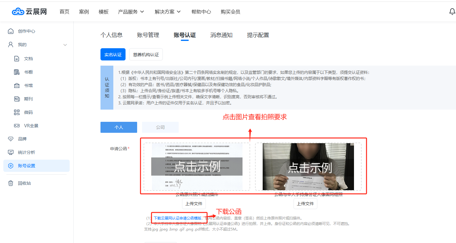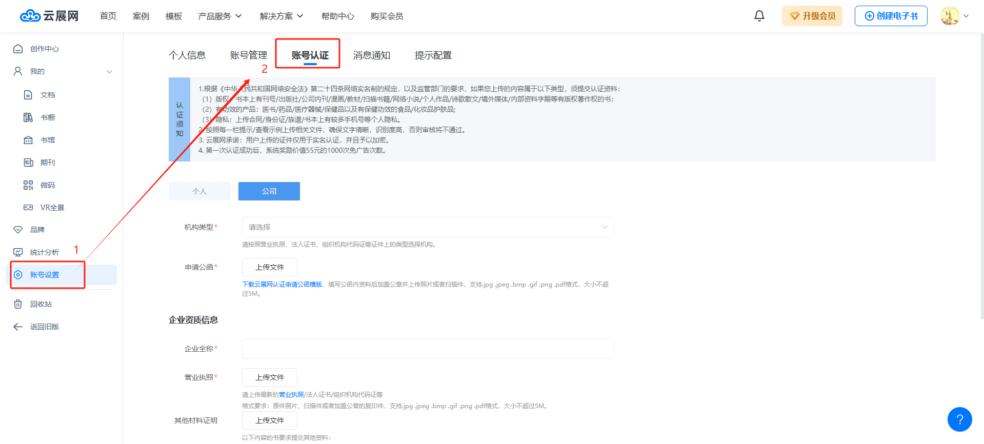電腦登錄云展網(wǎng)網(wǎng)站,登錄您的賬號(hào),點(diǎn)擊【賬號(hào)設(shè)置】,點(diǎn)擊【賬號(hào)認(rèn)證】打開(kāi)賬號(hào)認(rèn)證界面