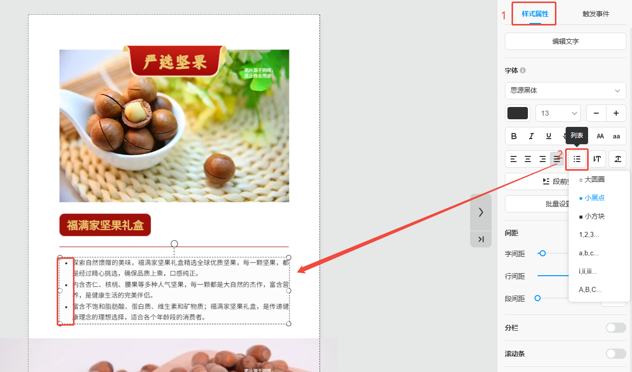 雙擊文本框進入編輯狀態,點擊【列表】選擇符號樣式,文本里的每一段前面將會添加一個符號。