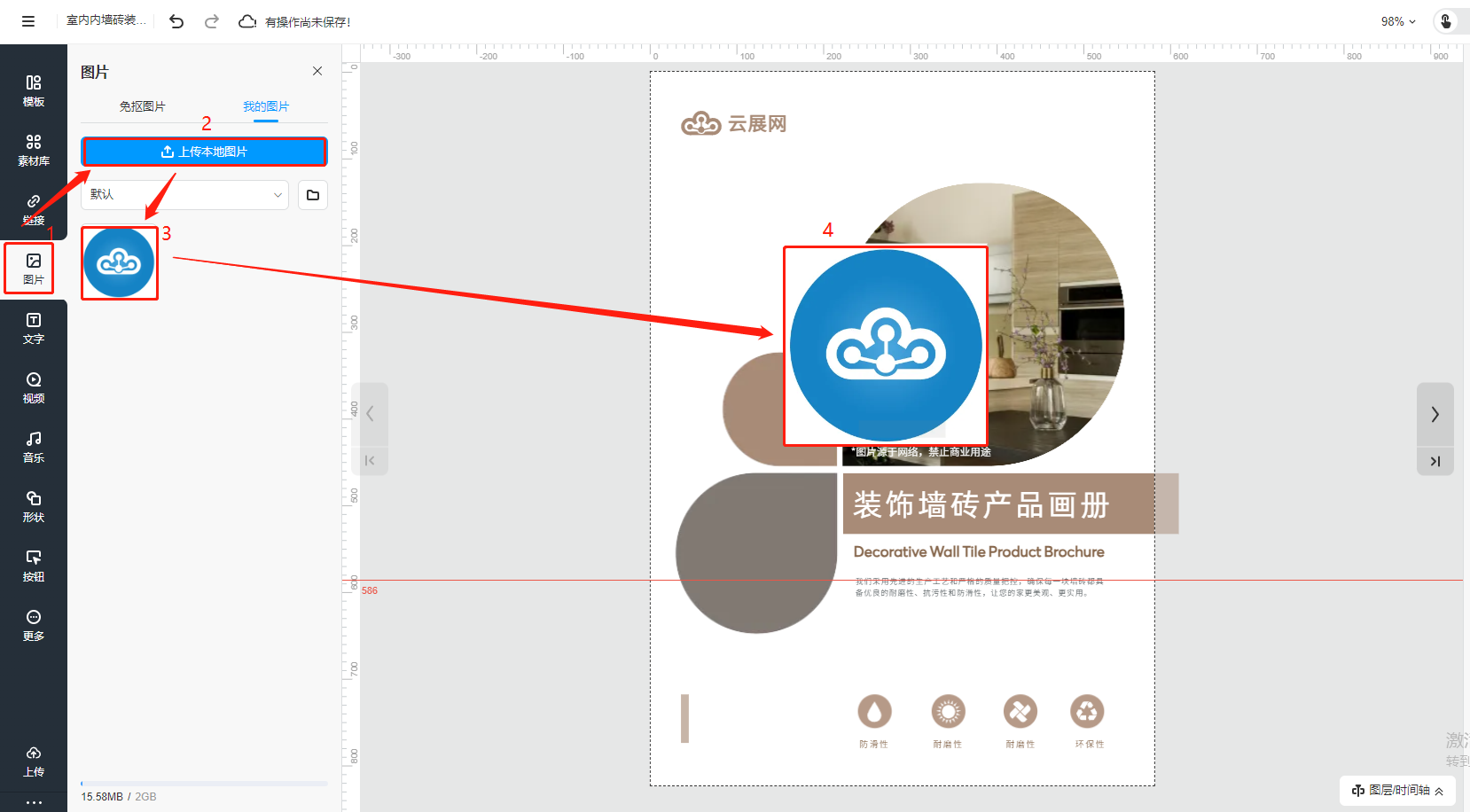 選擇【圖片】進入圖片界面,點擊【上傳本地圖片】,選擇電腦上的圖片進行上傳,上傳成功的圖片會出現(xiàn)在下方圖片欄,再次點擊一下圖片,圖片會直接出現(xiàn)在頁面上,點擊拖動可以調(diào)整位置,也可以調(diào)整大小。