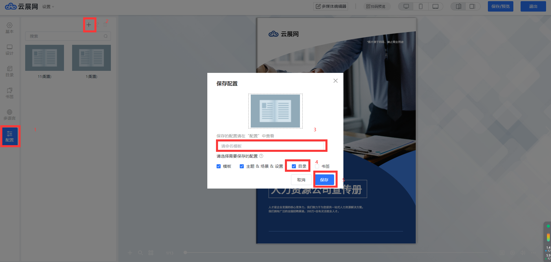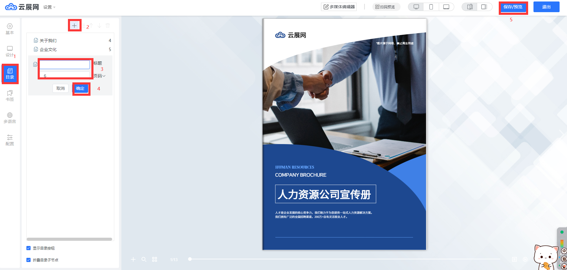 選擇【目錄】,點擊【+】按鈕,即可設(shè)置標題,頁碼。添加好所有目錄后點擊保存預(yù)覽。