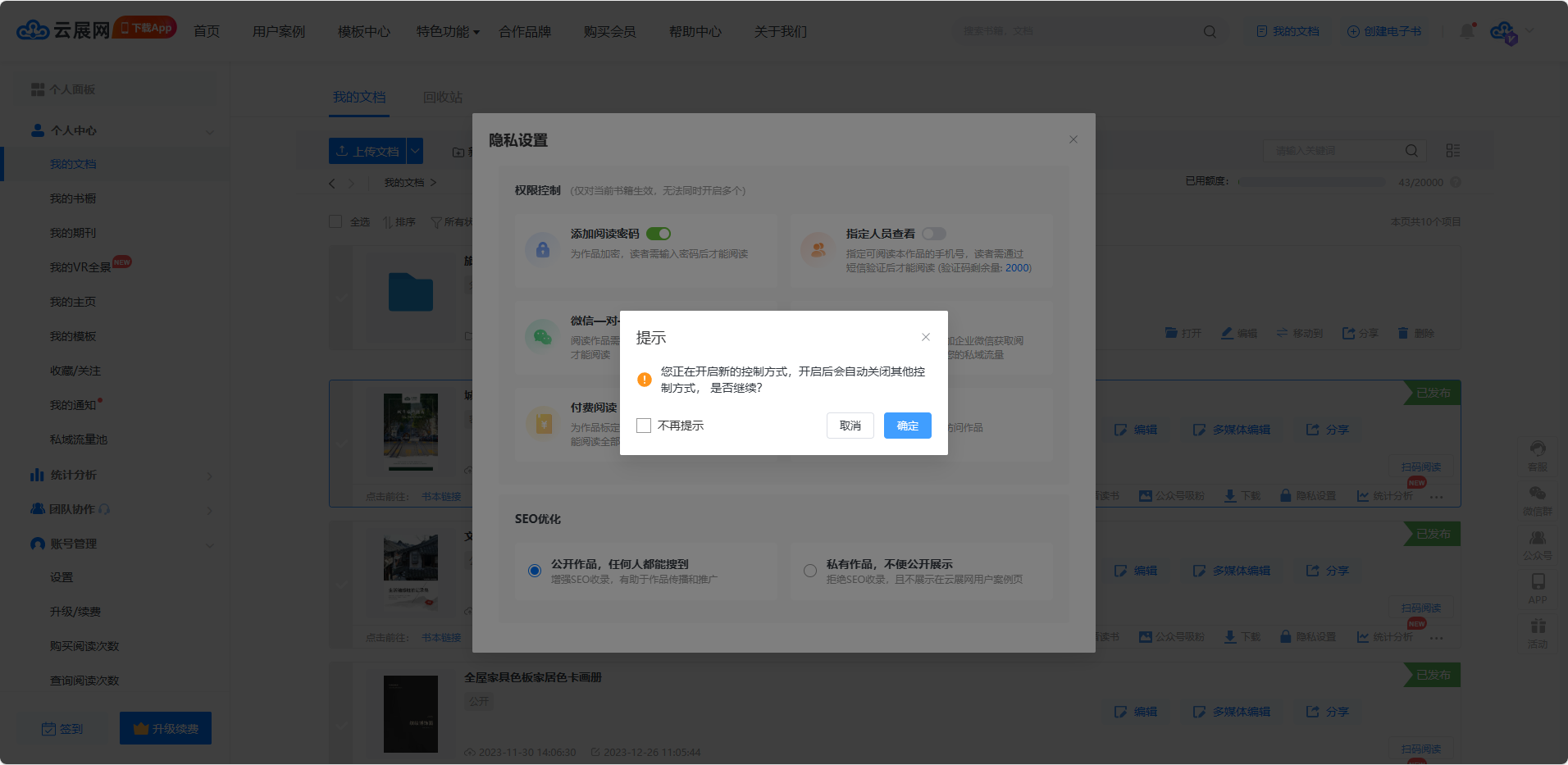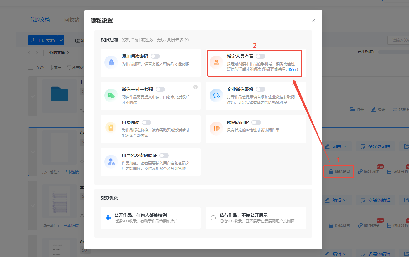 找到需要設置指定人員查看的電子書,點擊【隱私設置】。開啟【指定人員查看】選項。