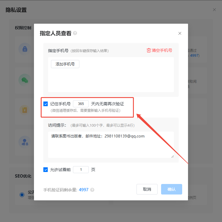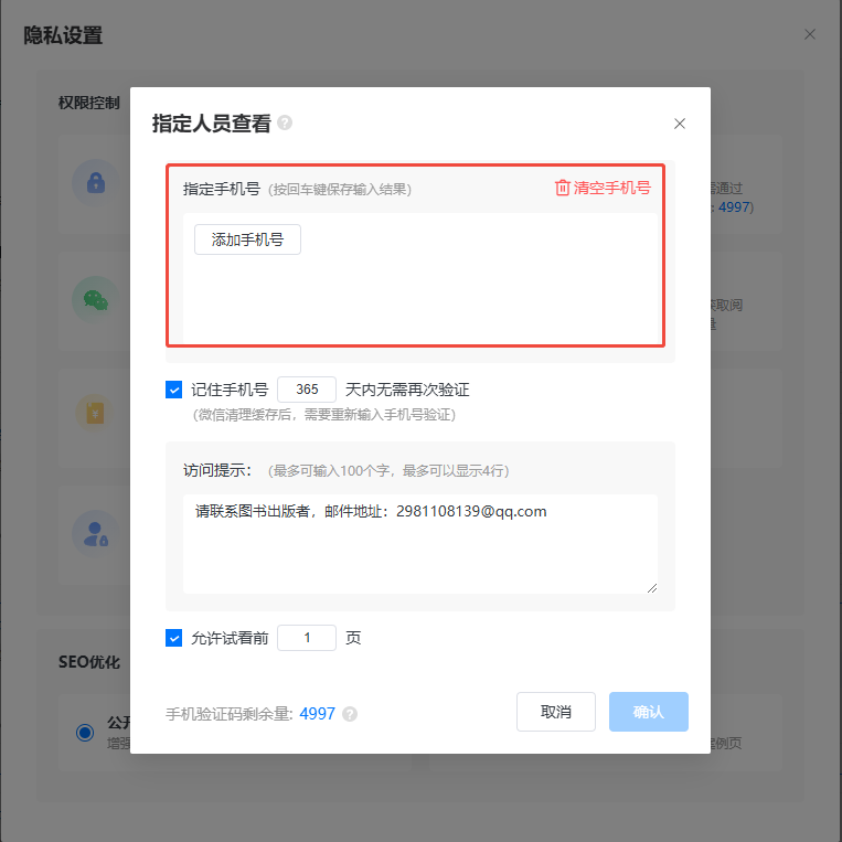 如果你想允許讀者看幾頁之后再要求輸入手機號驗證,可設置一下允許查看幾頁。