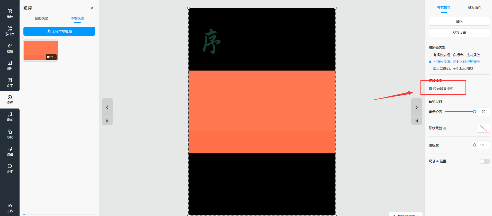 點擊【視頻】,點擊【上傳本地視頻】,將視頻添加的頁面上,然后選擇【無按鈕,由時間軸控制播放】
