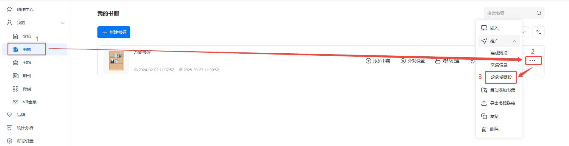 (1)選中【文檔】/【書櫥】,點擊右邊三個點,然后點擊公眾號吸粉。