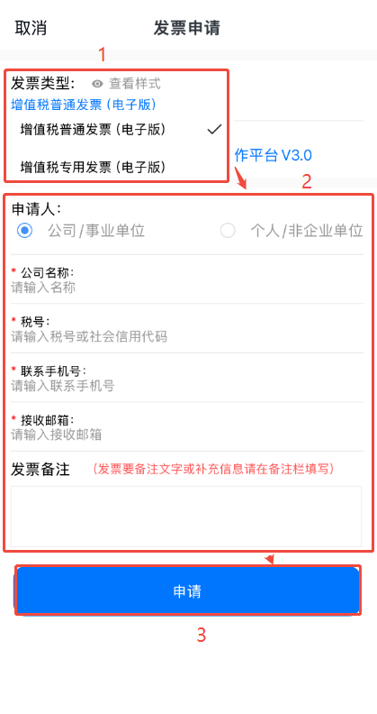 點擊【增值稅普通發票(電子版)】,選擇發票類型然后填寫相關信息,信息要確保無誤,如需在發票上備注文字,或者普票需要補全地址電話開戶行賬號的,請在發票備注欄上填寫,避免影響報銷,填寫完點擊下方【申請】即可。