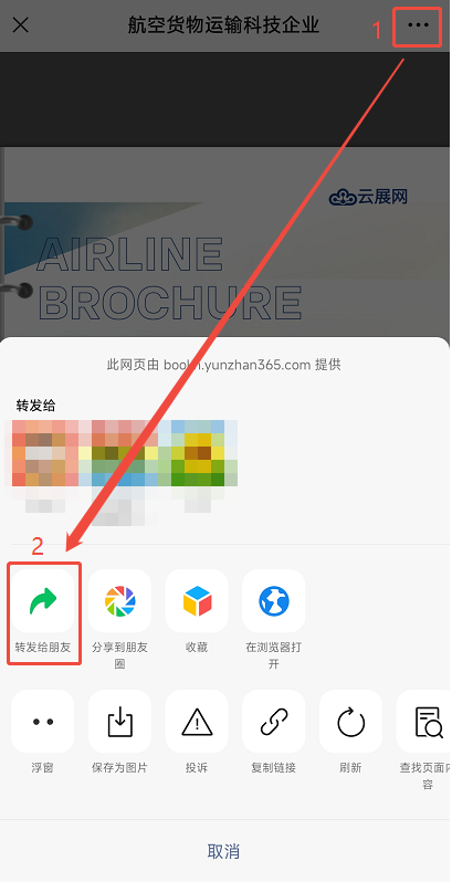 b)打開電子書后,點(diǎn)擊右上角三個(gè)點(diǎn),選擇【轉(zhuǎn)發(fā)給好友】,即可分享出名片的形式。