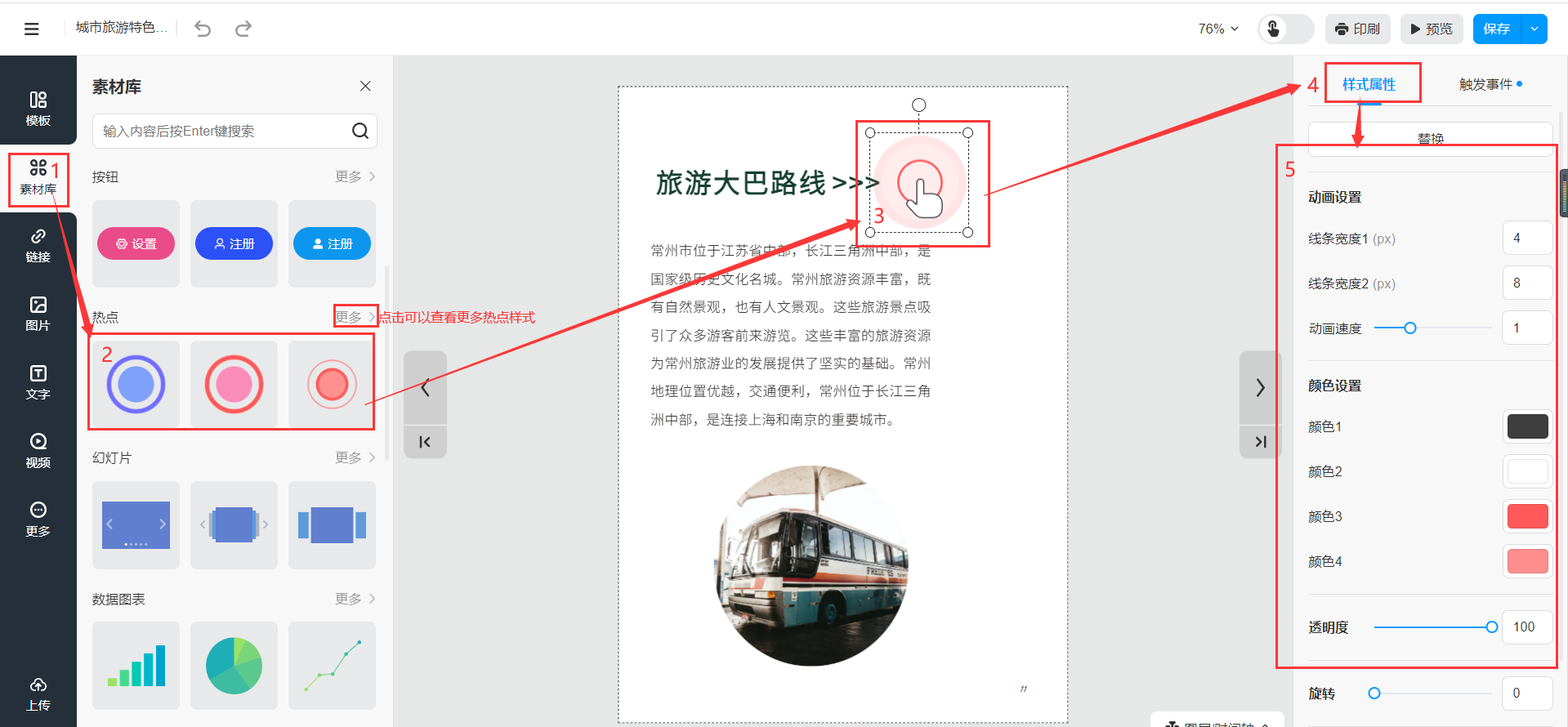 點擊【素材庫】,選擇【熱點】添加在頁面合適的位置上,右側點擊【樣式屬性】可更改熱點樣式