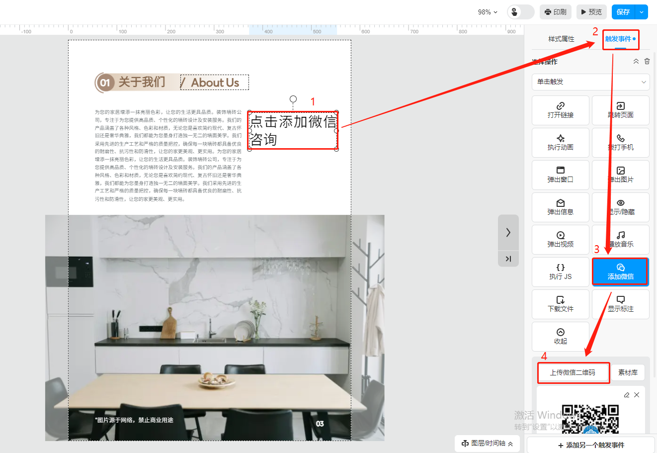 選中需要彈出微信二維碼的文字或者圖片,點(diǎn)擊右上角的【觸發(fā)事件】,選擇【添加微信】,然后點(diǎn)擊【上傳微信二維碼】上傳微信二維碼圖片。