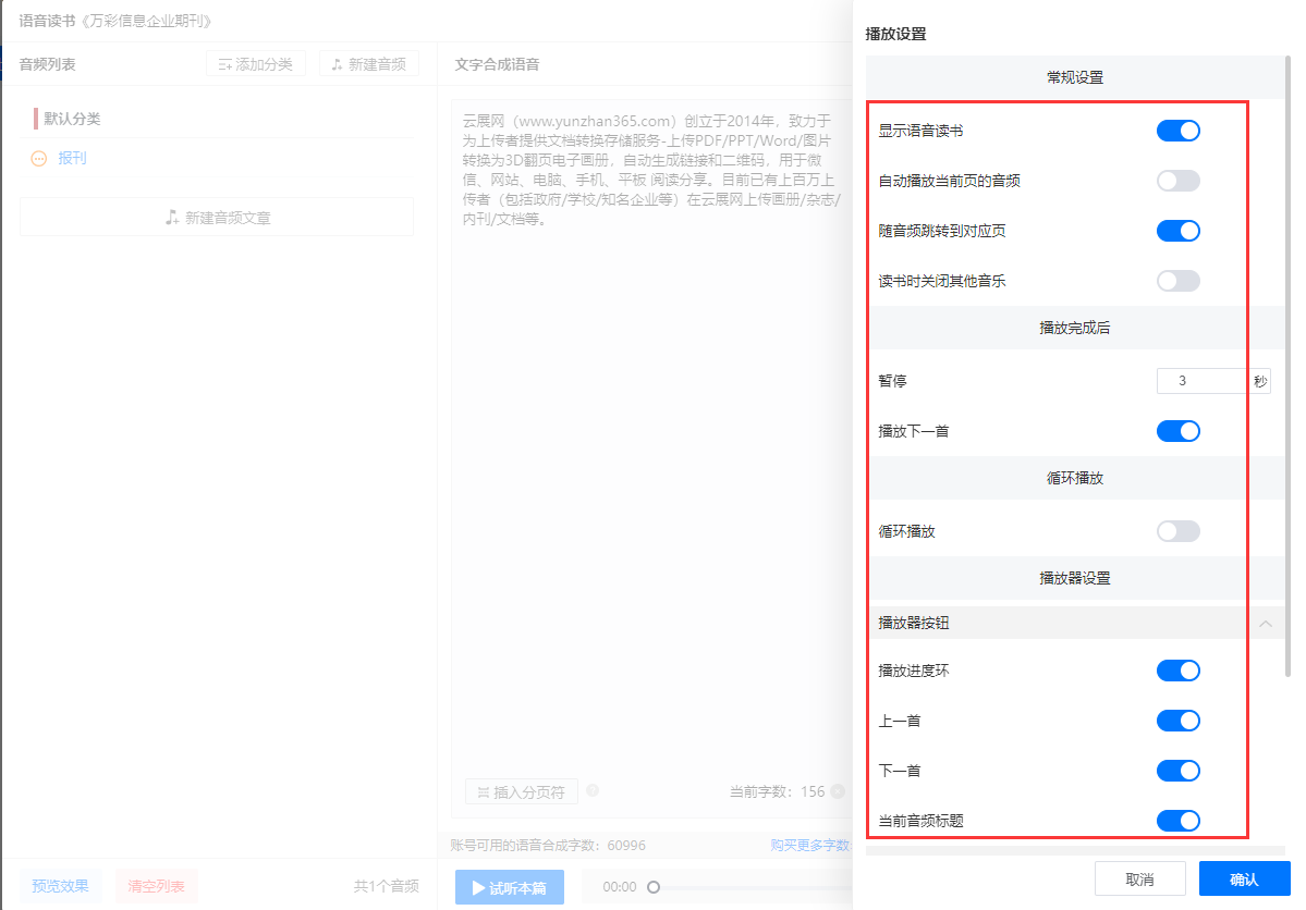 語音讀書的播放設置,支持自定義設置語音播放器的logo,播放器樣式等,設置個性化的語音閱讀模式體驗。