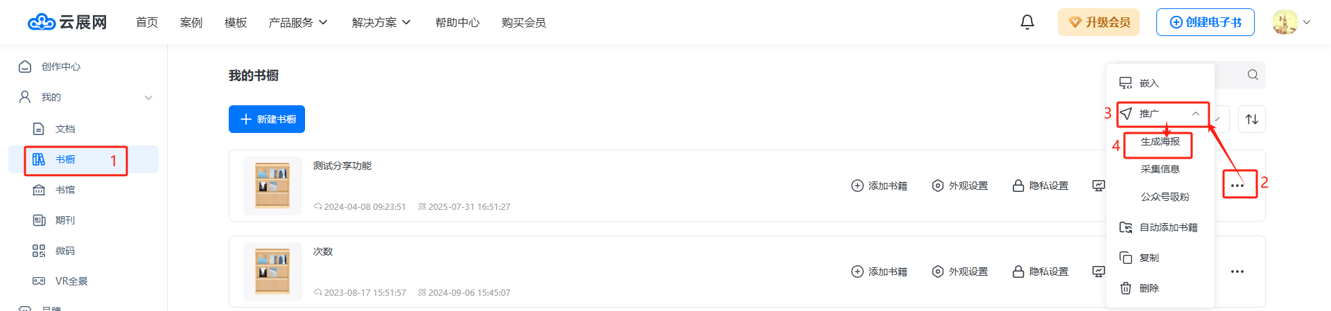 如何生成書櫥海報? 一、功能介紹 電子海報,也是日常中常見的一種宣傳方式,海報不僅能提高品牌形象,還能拓展品牌認知度,有利于推廣市場。讀者掃碼進入書櫥,可以同時看到書櫥里的所有書,還能互相轉發,非常方便。 二、操作步驟 1、生成海報 在【書櫥】頁面,點擊右邊三個點,隨后點擊【推廣】,點擊【生成海報】。 2、選擇模板 點擊【模板】,選擇一款合適的模板。 3、編輯海報內容 點擊【設置】,編輯海報內容。 4、下載海報 編輯好之后點擊【保存信息】,然后點擊【下載海報】,即可下載下來。