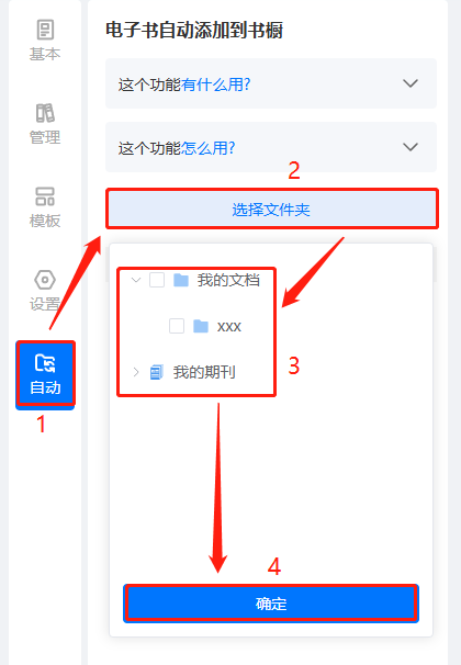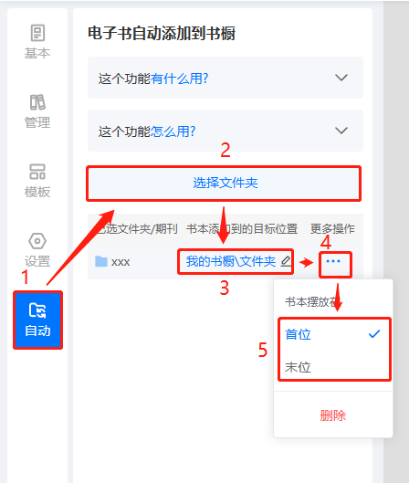 (2)先點擊【自動】,再點擊【選擇文件夾】,勾選文件夾/期刊,選擇書本需要添加到的目標位置和擺放位置,后續(xù)在所選文件夾/期刊內(nèi)新上傳的書,將會自動添加到該書櫥內(nèi)。