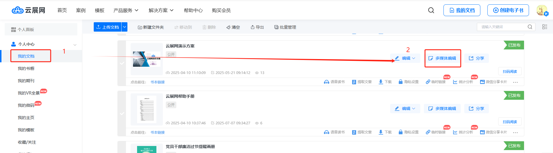 在【我的文檔】/【文檔】頁面,找到你想編輯的電子書,選擇【多媒體編輯】/【內(nèi)容編輯】進(jìn)入多媒體編輯界面。