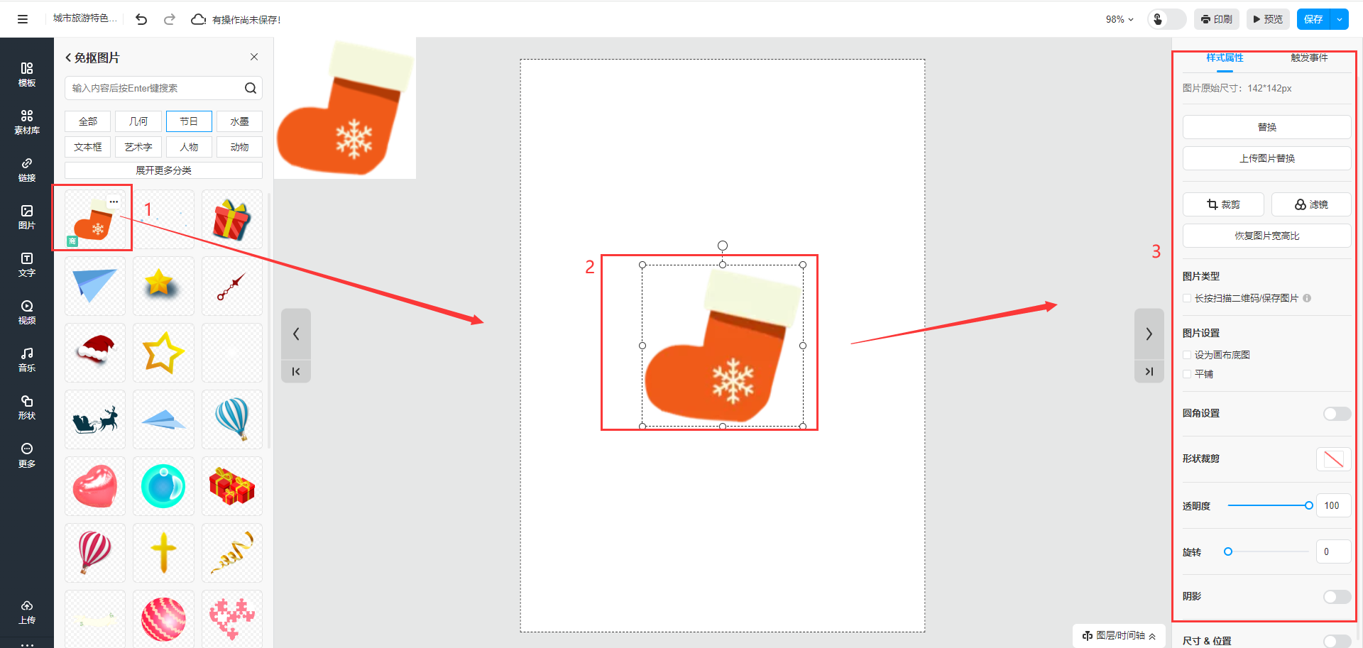 選中你想要設置樣式屬性的元素,在右側屬性面板可進行對齊、替換、動畫、顏色、透明度、陰影、尺寸和位置以及旋轉等設置。