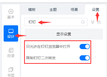 如何使電子書只能在釘釘上打開并禁止分享 如果您的電子書需要僅在釘釘上可以打開觀看,且無法分享給釘釘上的其他好友的話,是可以的。 在非釘釘的平臺上打開電子書會顯示“請在釘釘客戶端打開鏈接”,且沒有分享按鈕,效果如下: 操作如下: 1.打開編輯 2.點擊“設計”,點擊“設置”,搜索框搜索“釘釘”,打開以下兩個配置 3.點擊右上角保存即可