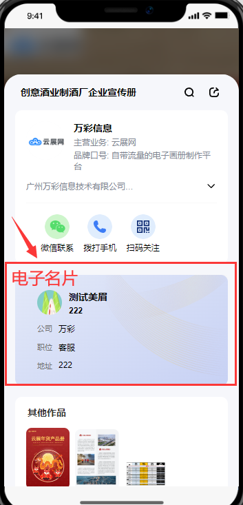 電子名片是指添加您的logo圖、姓名、職位、微信號,電話等信息形成電子名片,展示在相關內容面板上,可以快速地與潛在客戶建立聯系,提高溝通效率和響應速度。