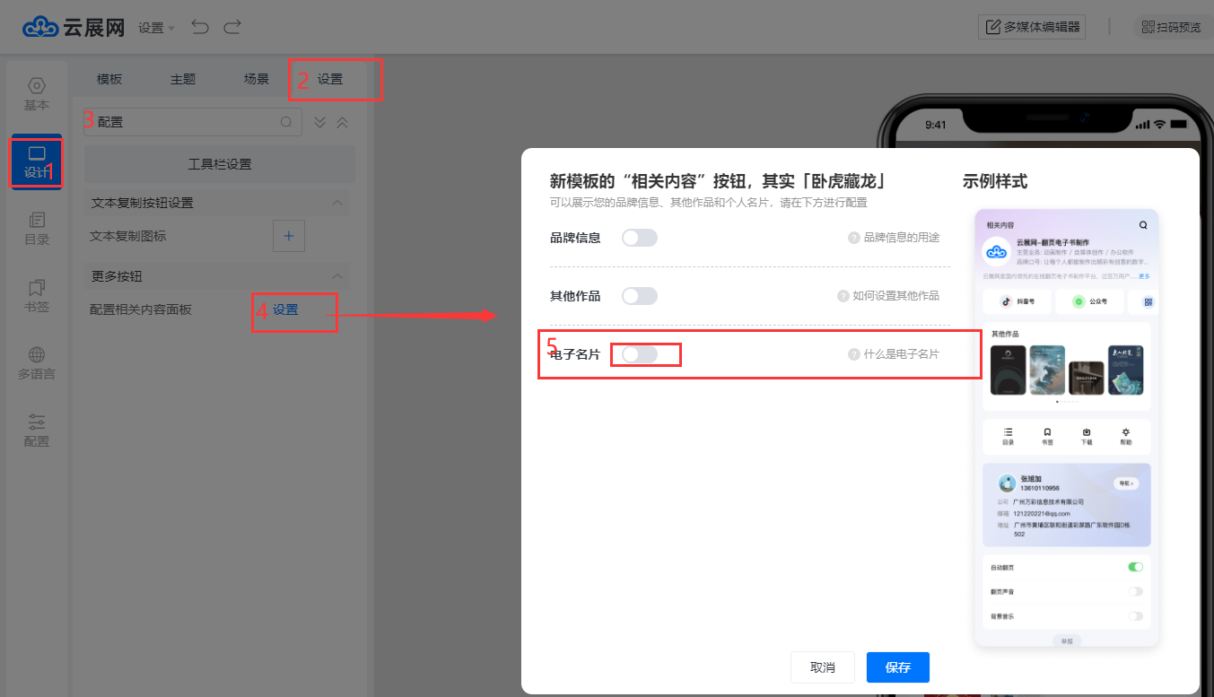 點擊【設計】,點擊【設置】,在搜索欄輸入”配置”關鍵字查找,點擊【配置相關內容面板】設置,開啟電子名片功能