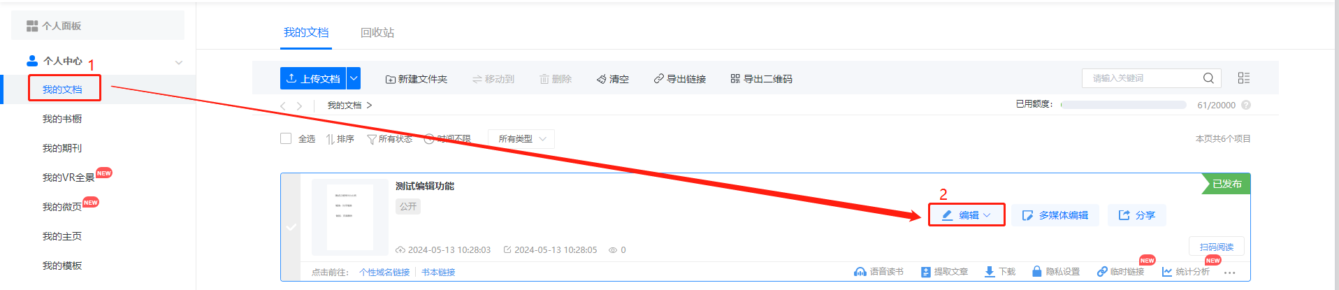 點擊【我的文檔】,點擊設置好配置的畫冊的【編輯】,打開編輯界面。