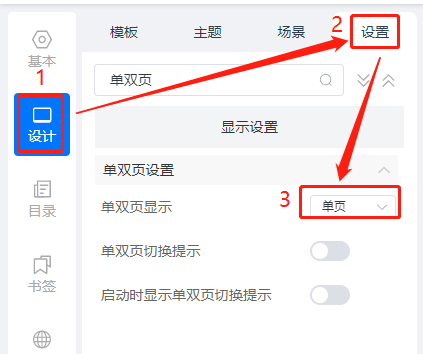 點擊【設(shè)計】,再點擊【設(shè)置】,單雙頁顯示選擇【單頁】。