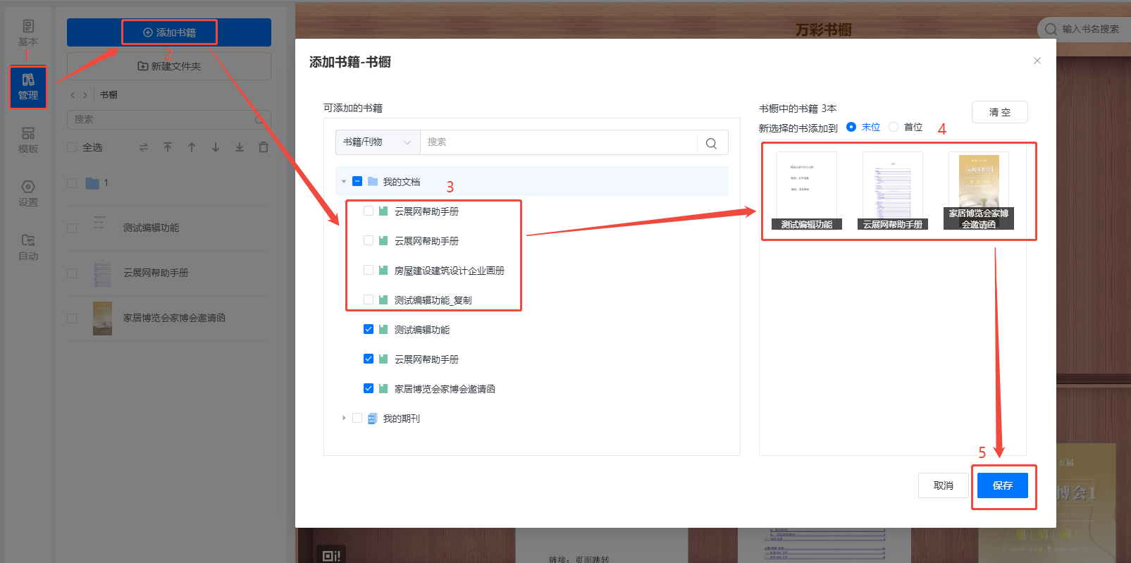 b)先點擊【管理】,再點擊【添加書籍】,勾選需要添加的書籍,點擊保存。