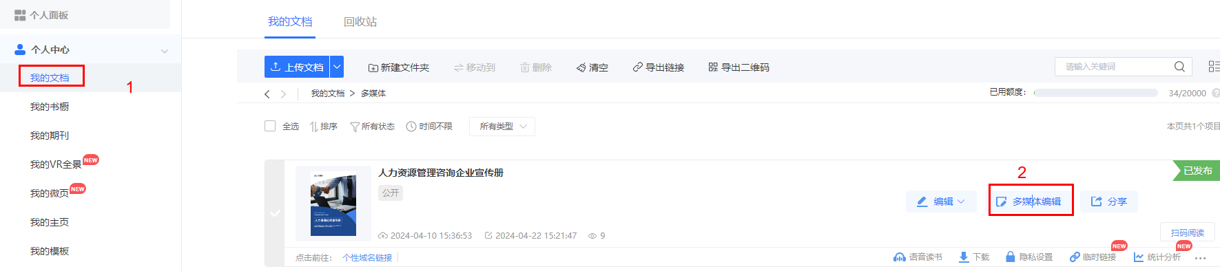 點進【我的文檔】/【文檔】,選擇對應電子書,點擊【多媒體編輯】/【內容編輯】。