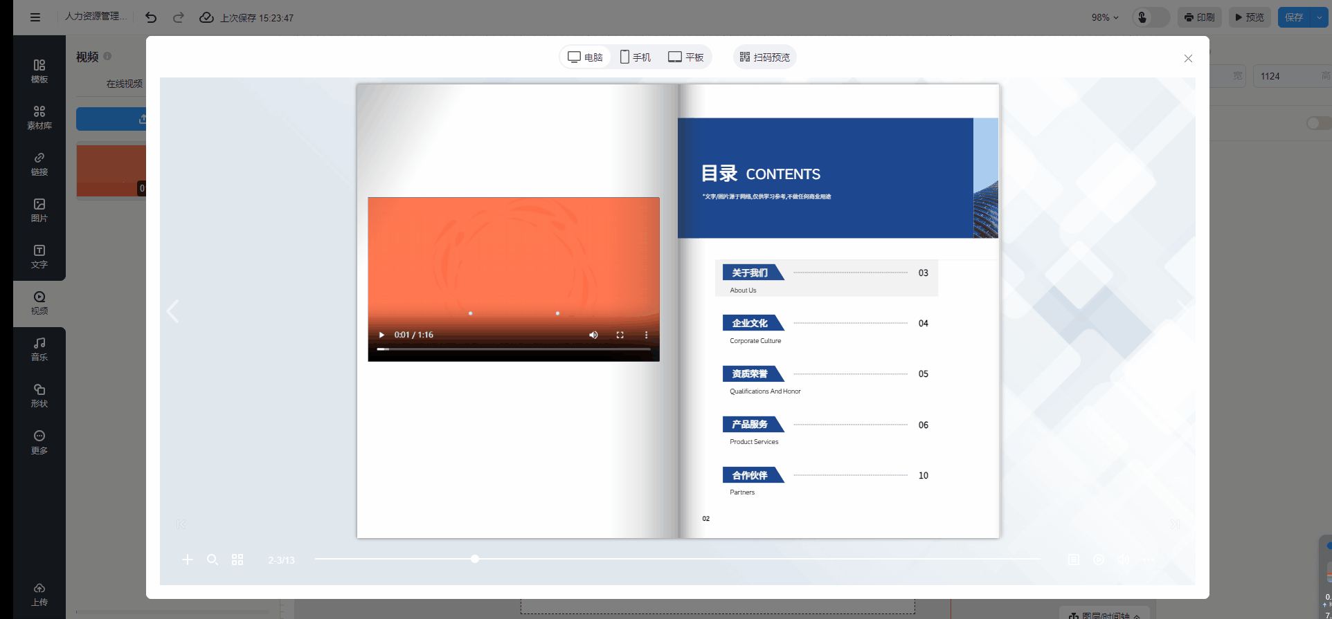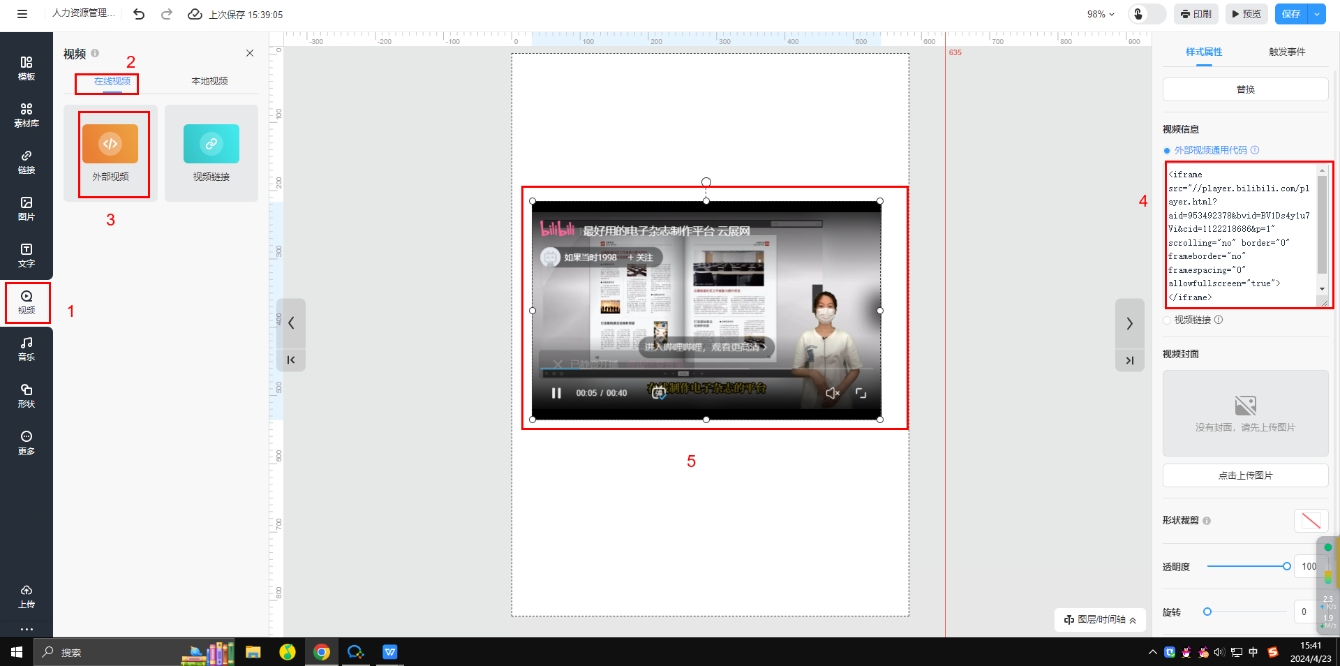點擊【外部視頻】將視頻框放至畫布,把你的視頻上傳到第三方視頻網站如:bilibili,騰訊,愛奇藝等,上傳以后通過點擊分享來獲取內嵌代碼,并輸入到【外部視頻通用代碼】里生成視頻,調整視頻框的位置和大小。