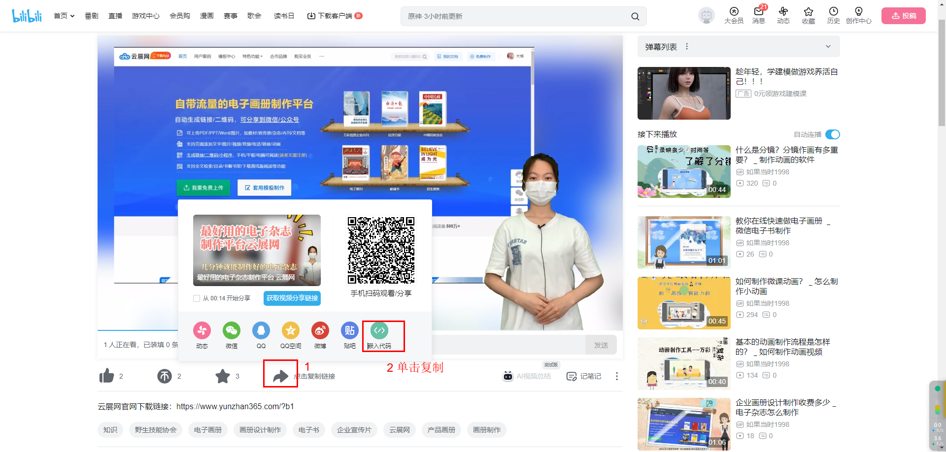 打開視頻網站,如嗶哩嗶哩,點擊分享按鈕,單擊復制嵌入代碼。