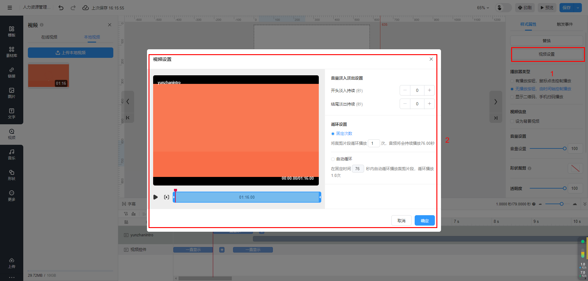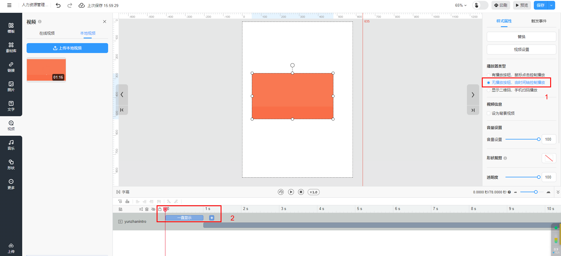 溫馨提示:【無播放按鈕,由時間軸控制播放】僅支持上傳本地視頻類型勾選。