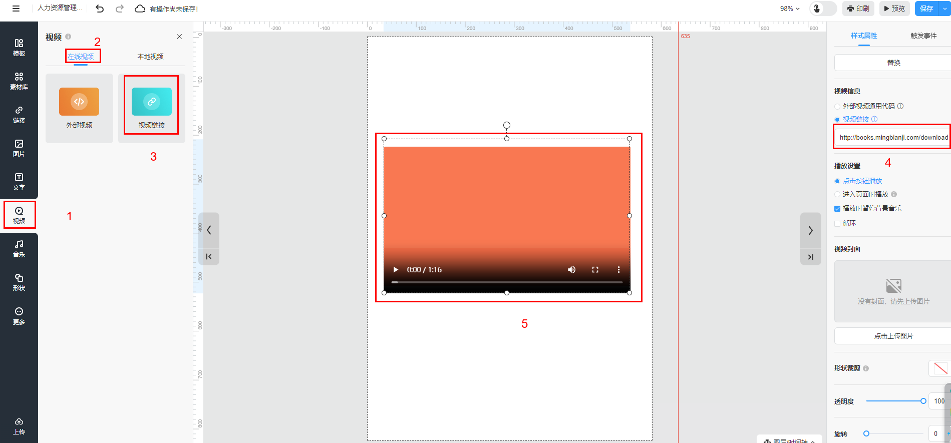 點擊【視頻鏈接】將視頻框放至畫布,調整視頻框的位置和大小,將你的視頻鏈接輸入到【視頻鏈接】。