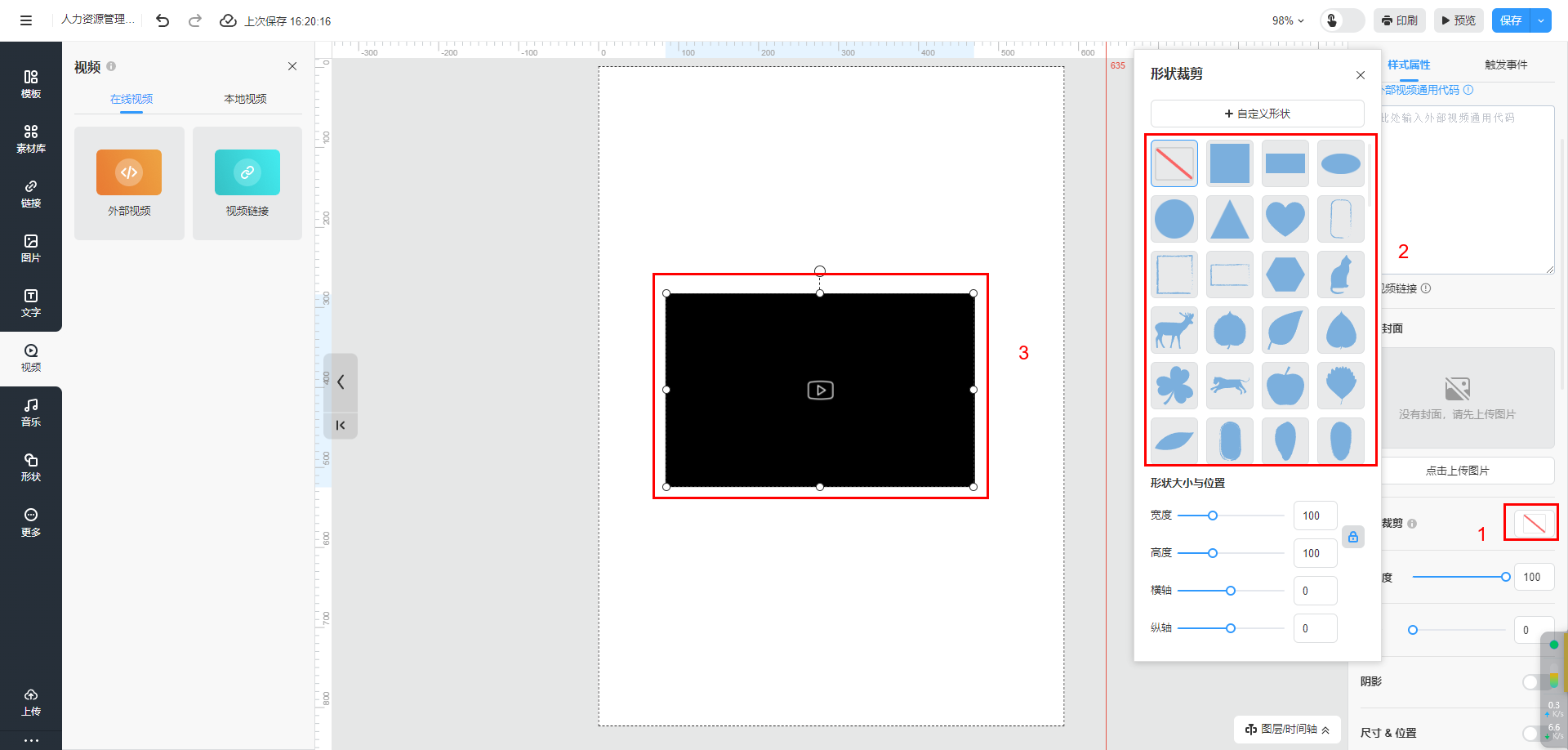 溫馨提示:在進行形狀裁剪時,請注意不要裁剪掉播放控件,或者你也可以選擇“進入頁面時自動播放”選項,以便在使用形狀裁剪時保持播放的順暢。