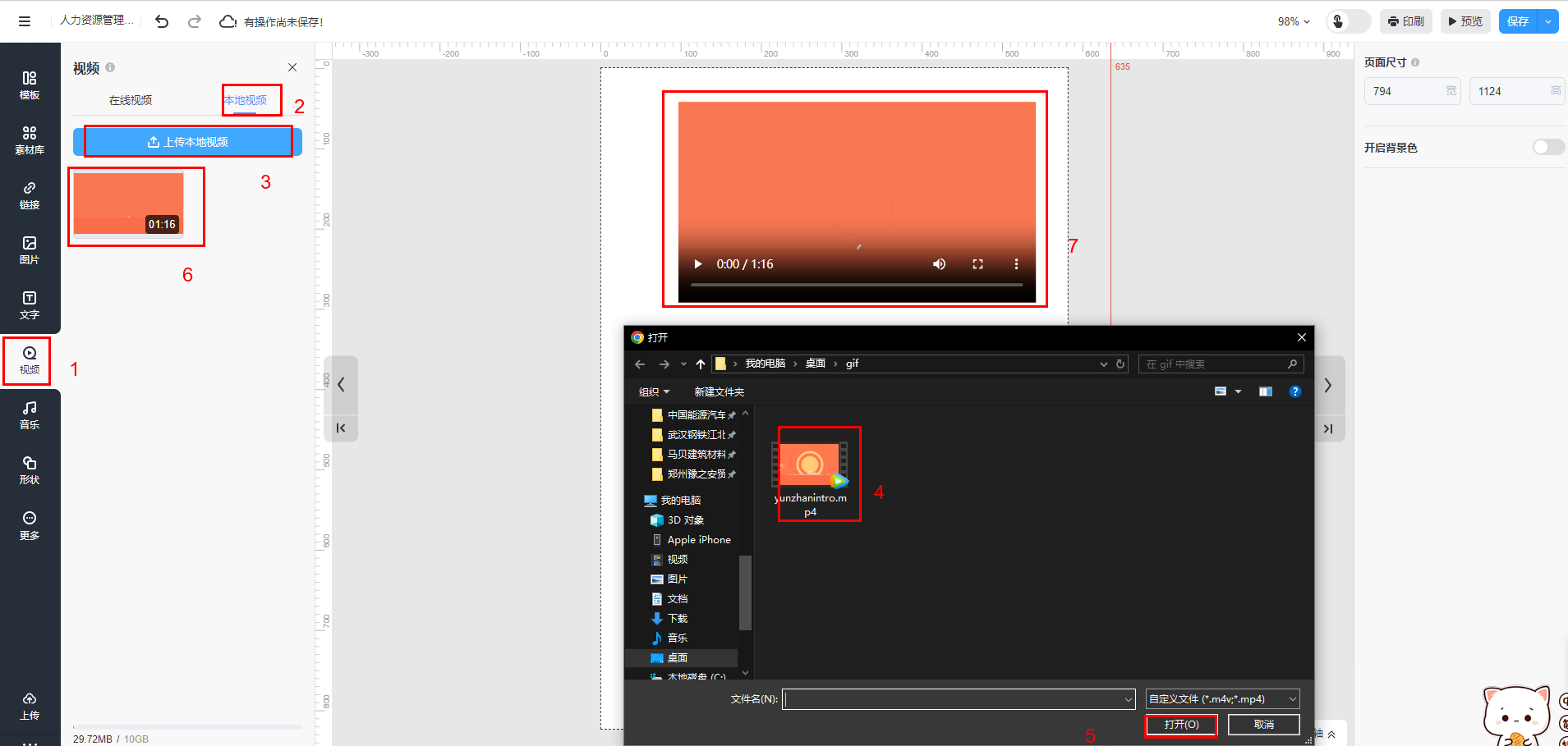 點擊【上傳本地視頻】,選中視頻后選擇【打開】,上傳完成后,選中視頻并單擊到畫布,并調整視頻框在畫布的位置和大小。你可以也在對本地視頻進行刪除、上傳封面操作。