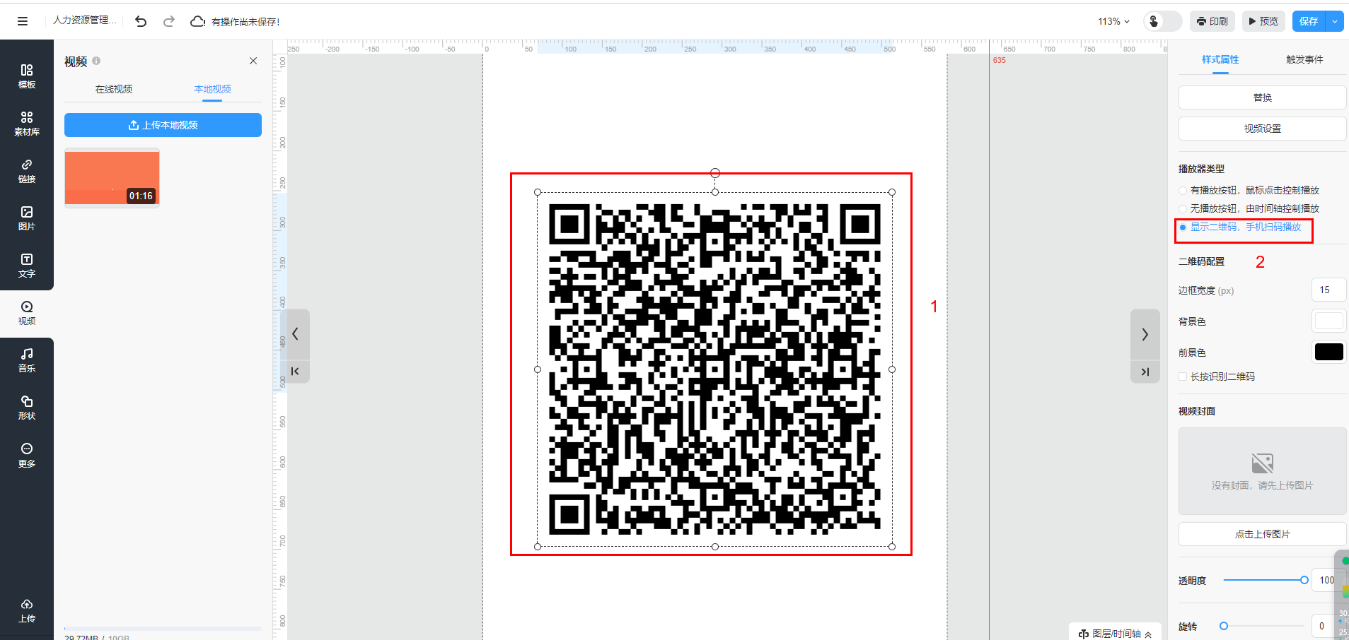 插入本地視頻后,勾選【顯示二維碼,手機掃碼播放】