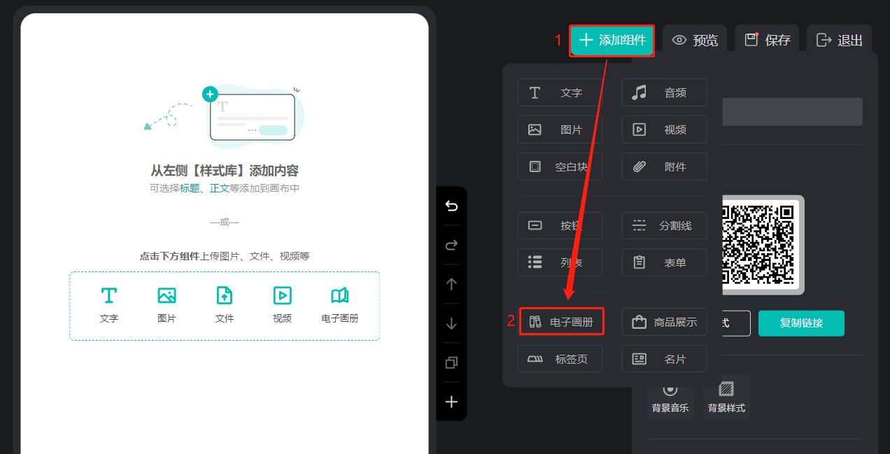 點(diǎn)擊【添加組件】,選擇【電子畫(huà)冊(cè)】。