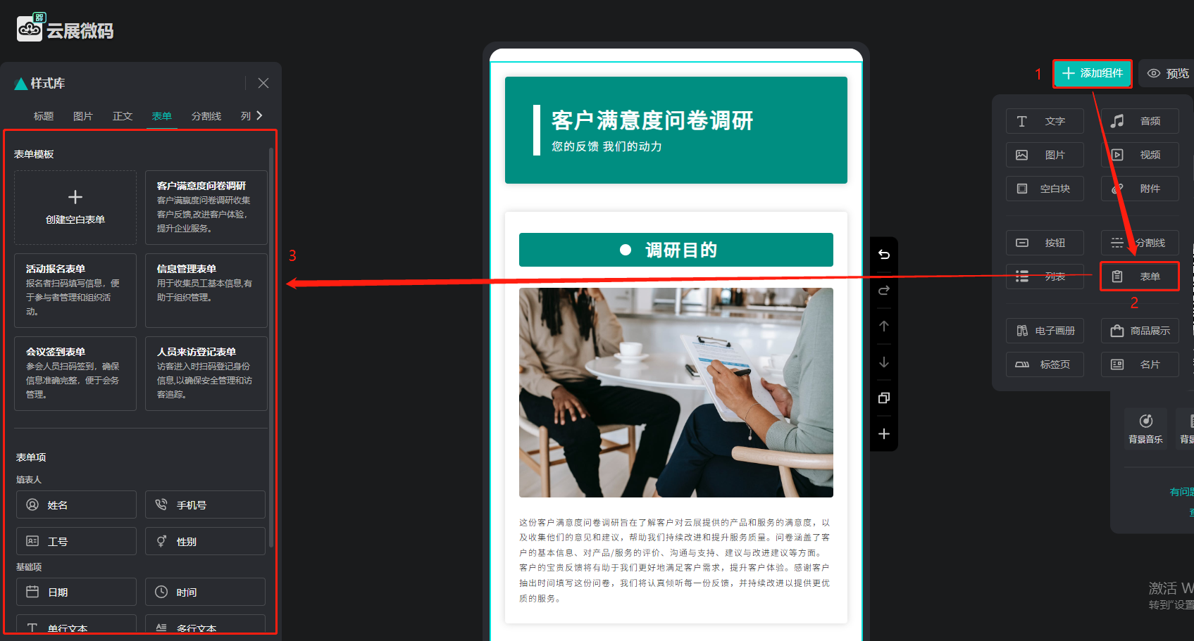 點(diǎn)擊【添加組件】,點(diǎn)擊【表單】,左側(cè)選擇【表單模板】,如有需要也可以添加【表單項】。