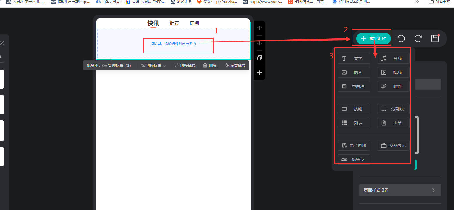 點擊【標簽頁內】,點擊【添加組件】,可以添加文字,圖片,音視頻,按鈕,表單等內容在標簽頁上。