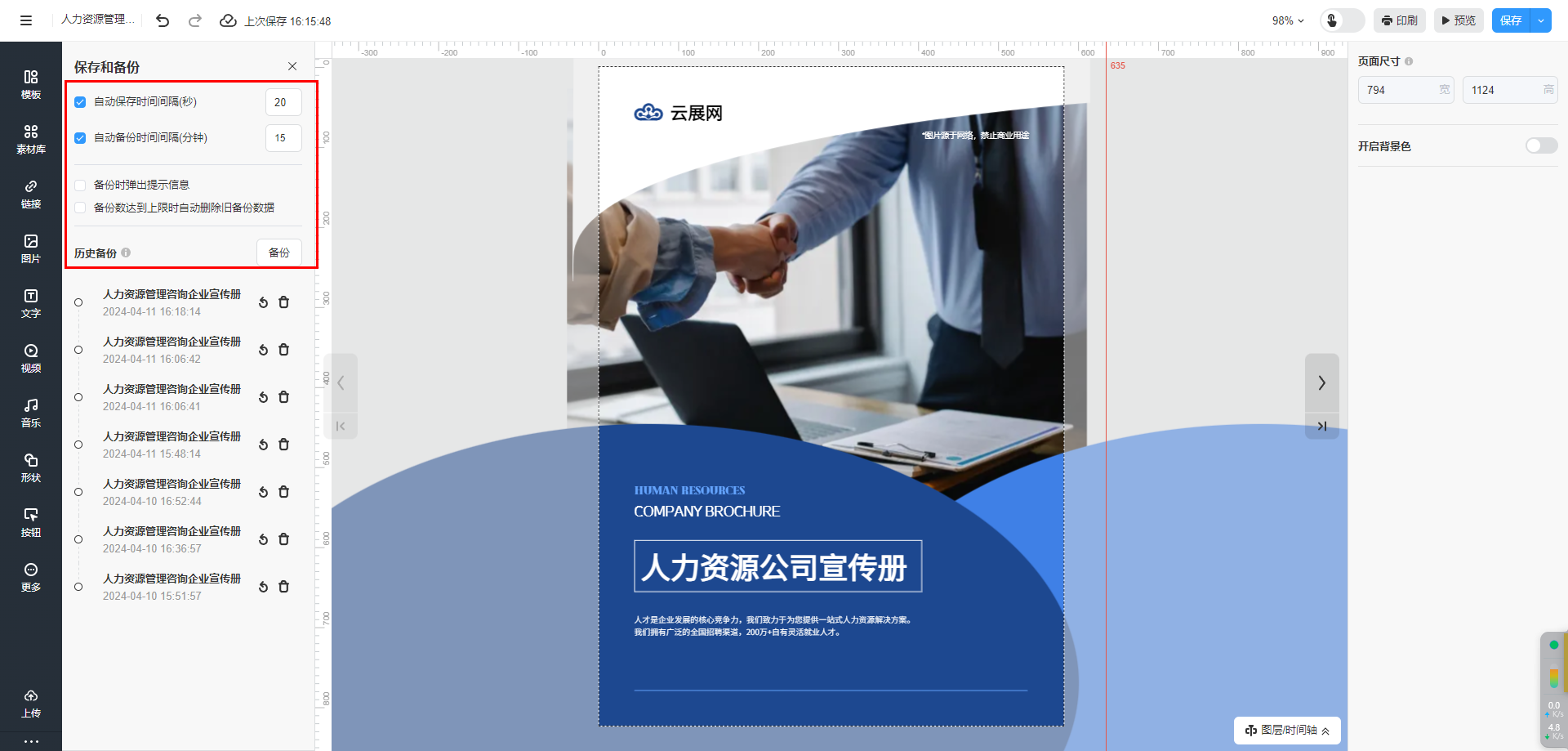 所有設置完成以后,在多媒體編輯器右上角點擊【保存并備份】。