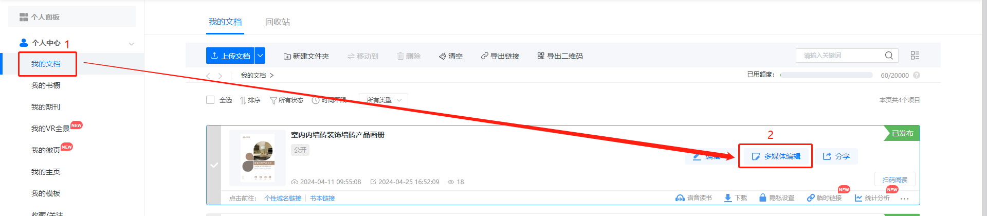 點進【我的文檔】/【文檔】,選擇對應電子書,點擊【多媒體編輯】/【內(nèi)容編輯】。