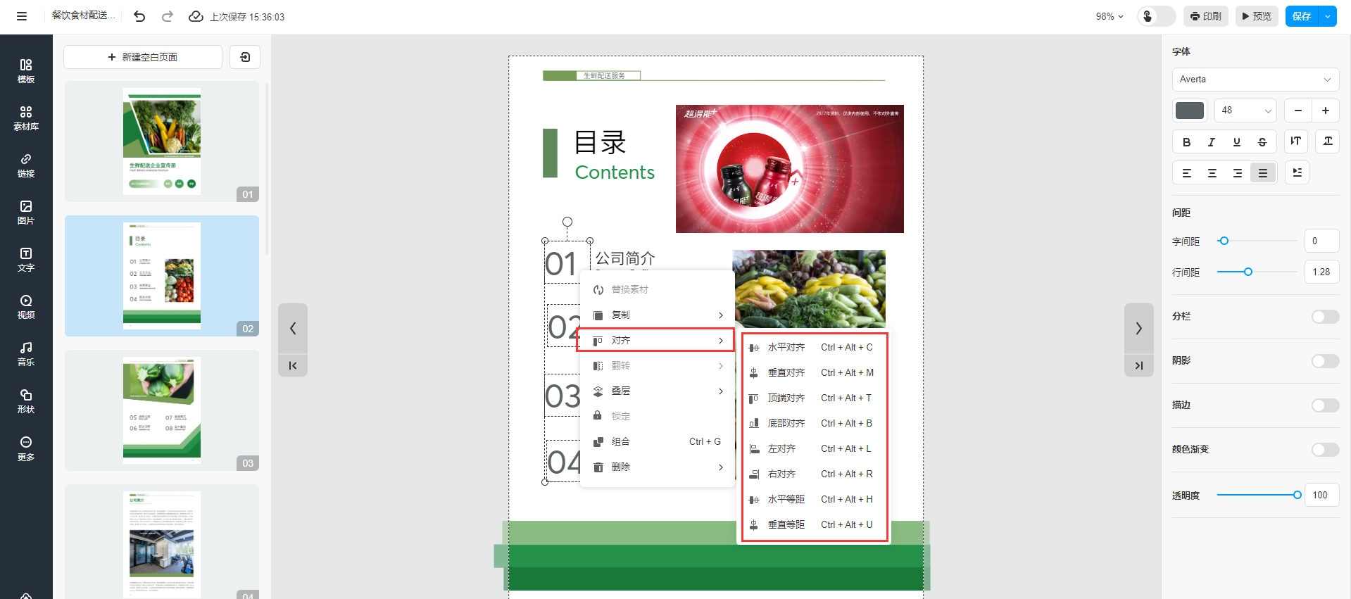 當(dāng)頁面中有多個(gè)素材/文本框需要對齊時(shí),可以通過設(shè)置文本框的對齊方式,輕松地將頁面內(nèi)容整齊排列。