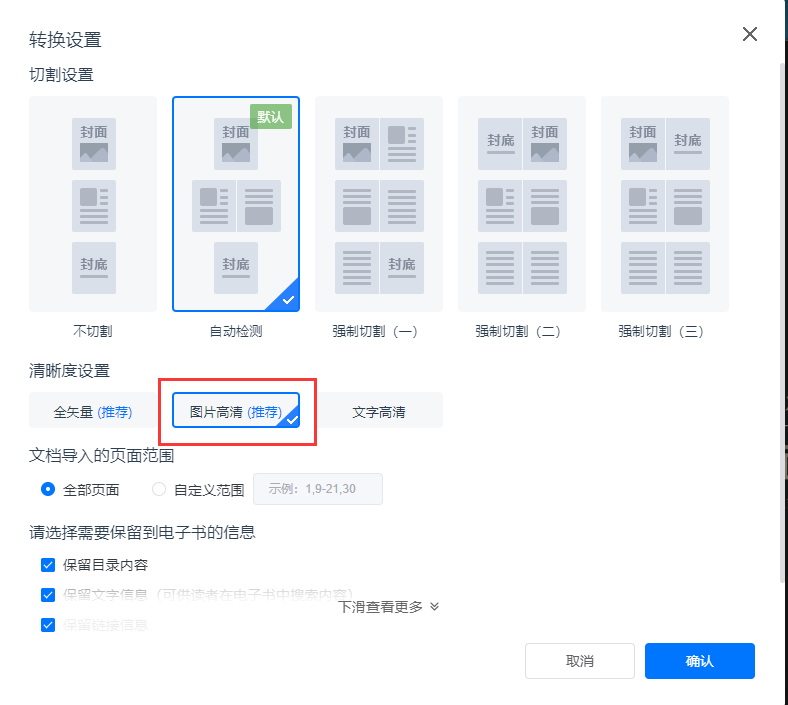 b)【清晰度設置】選擇【圖片高清】。